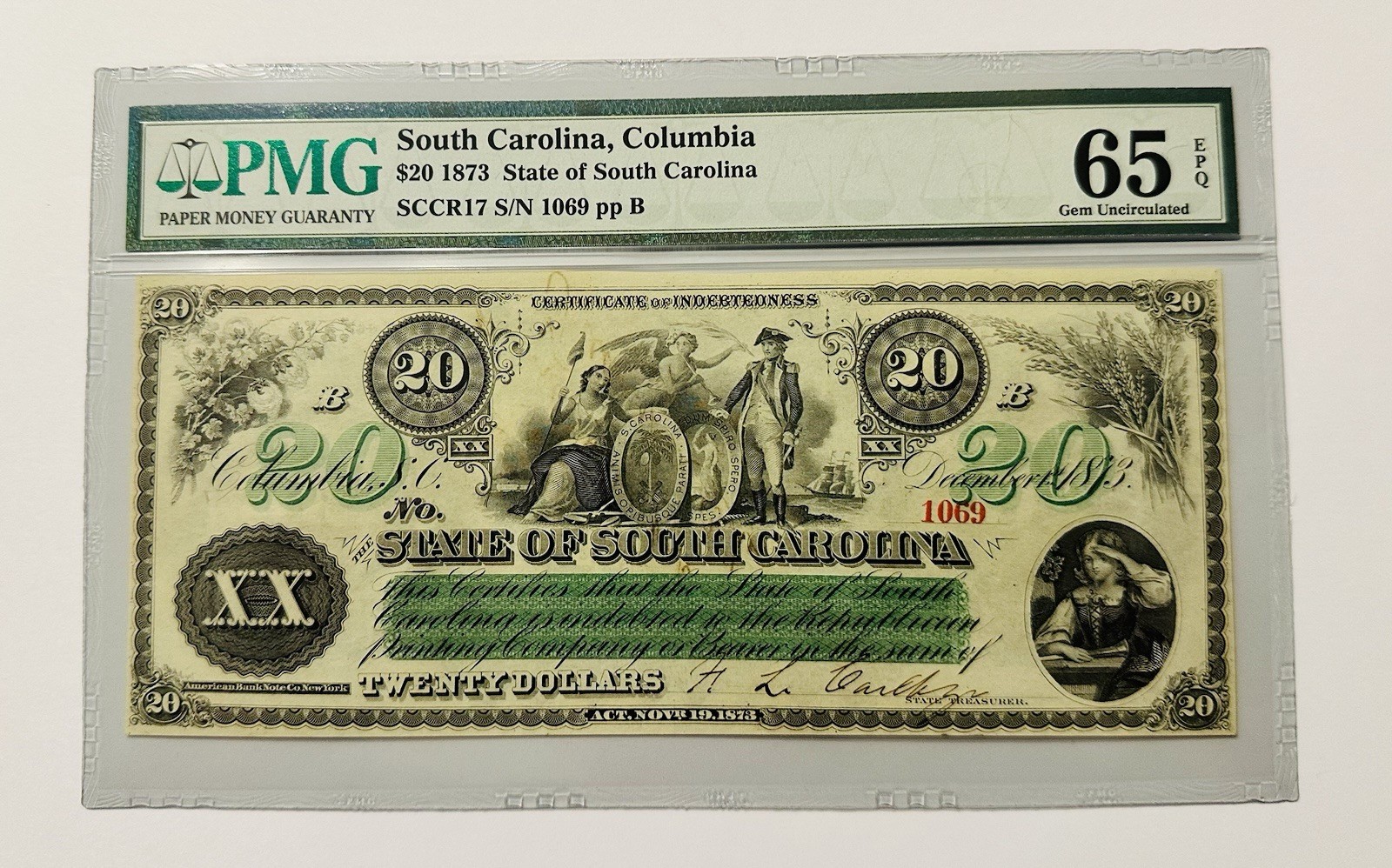 I am selling my entire currency collection. Please see the description below & check back for more notes to be listed everyday. This is a rare and highly sought after $20 State of South Carolina, Columbia in 1873 obsolete note. This note (Serial # 1069 ) has been certified by PMG with a grade of 65 Gem Uncirculated EPQ, indicating its high quality and authenticity. This banknote features very beautiful and ornate design elements for the time period. It holds historical significance as a collectors piece from the 1800’s. This note would make a great addition to any collection of US Currency especially in the obsolete paper money category.