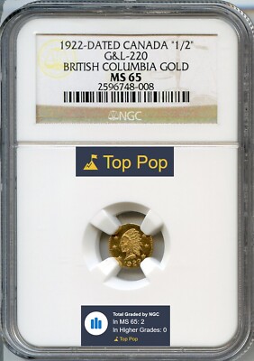 Very rare fractional British Columbia gold token. NGC shows this one Top Pop and ties it with one other. NGC’s total population is seven, and PCGS shows only 1 (MS-63), giving the Greene-220 a total pop certified of 8 by all grading services in all grades. Rarity 7. FINEST KNOWN / TOP POP! Nice semi-prooflike surfaces. Solid gold as tested by NGC during their extensive certification process.