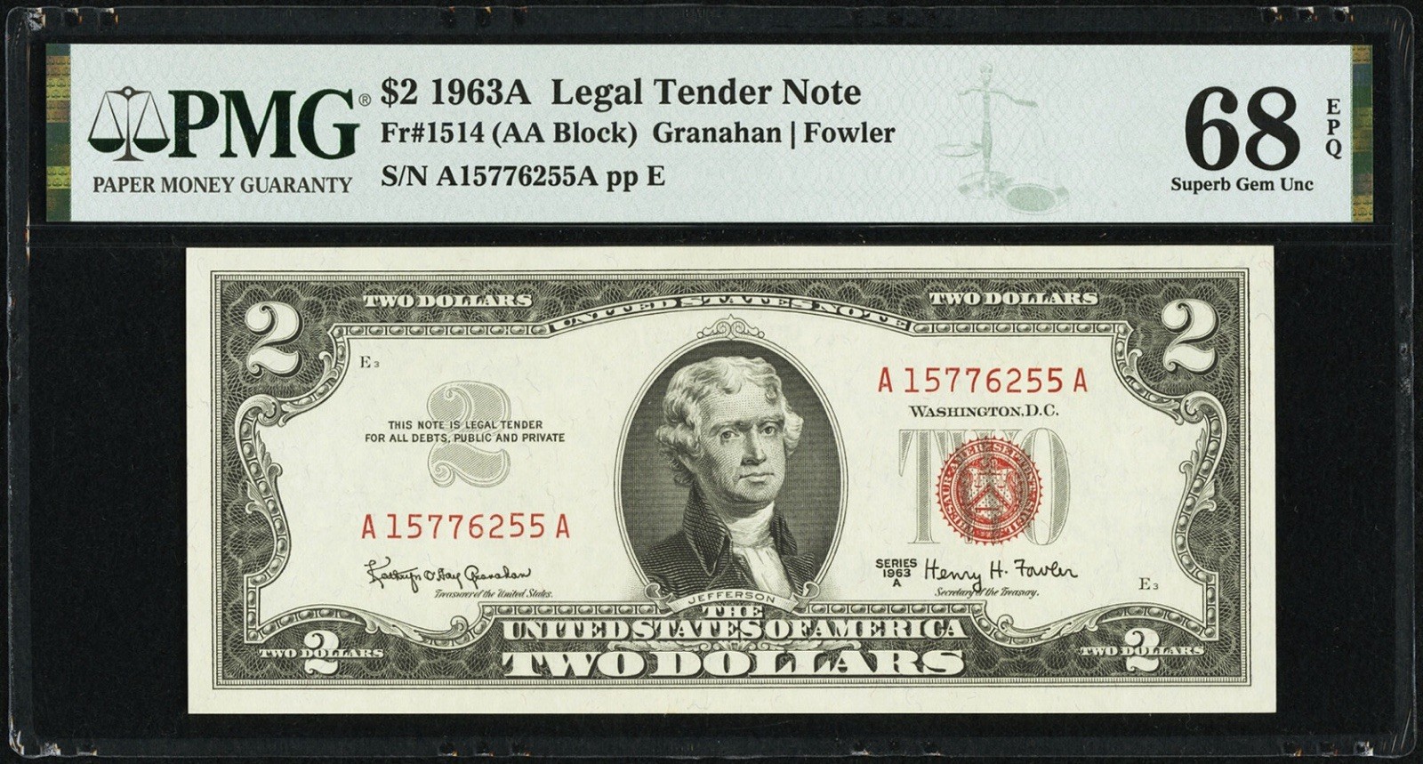 The product is a 2017 $2 Federal Reserve Note from the San Francisco branch, graded PMG 68 EPQ Fancy Serial 6666. This banknote is a small size, uncirculated note with a unique fancy serial number. PMG certification ensures its authenticity and grade, making it a desirable collectible for those interested in US paper currency.
