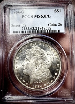 The 1884-O Morgan Dollar in MS-63 grade with a Strike Type of Proof-Like is a highly sought-after coin for collectors. Minted in the United States, this Silver coin has a fineness of 0.9 and is certified by PCGS. The big mirrors and look of Dmpl add to its appeal, making it a valuable addition to any collection of US dollars. This coin has heavy mirrors and almost looks dmpl. The coin you see is exactly what you get. If you have any questions feel free to reach out to me.