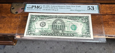 1995 $5 Federal Reserve Note New York PMG 53 Offset Printing Error. Fr#1984-B (BB Block), Withrow / Rubin, S/N B61003176B pp B. About Uncirculated EPQ. Exceptional Paper Quality, Offset Printing of Back to Front.