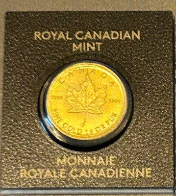 The product is a 2024 1g pure gold Canadian Maple Leaf coin featuring King Charles, minted by the Royal Canadian Mint. Each coin is certified with an assay number, indicating the authenticity and purity of the gold content (0.9999 fineness).