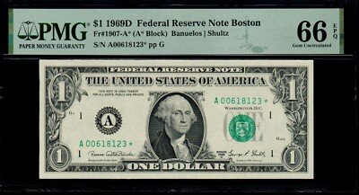 As of 3/16/25, this is a TOP POPULATION banknote, with 9 being graded a PMG 66 EPQ and none higher. This note is from the first print run of Series 1969D Boston Star Notes, and is a run of only 640,000 notes.