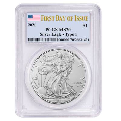 2021 $1 Type 1 American Silver Eagle PCGS MS70 FDOI Flag Label