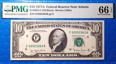The item is a 1977 $10 Federal Reserve Note from Atlanta, graded as PMG66 Gem EPQ. It is classified as an Uncirculated banknote with a Grade Designation of EPQ/PPQ. This small size note was produced in the United States and is certified by PMG.