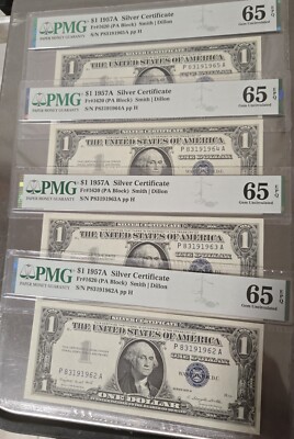 This set of four consecutive PMG GEM Uncirculated 65 EPQ Banknotes is a must-have for any serious collector of US paper money. The $1 Silver Certificates from 1957 are highly sought after and this set is no exception. Each note features the iconic portrait of George Washington on the front and the Great Seal of the United States on the back. These notes have never been circulated and are in pristine condition, making them a valuable addition to any collection. The certification number for each note is 2363560-010 to 013. Add this set to your collection today and enjoy the beauty and history of these rare pieces of currency.