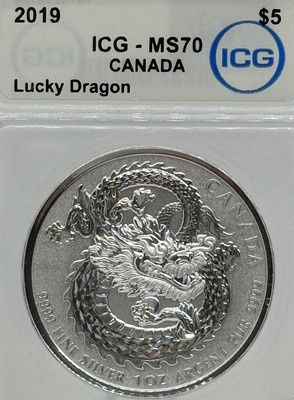 This 2019 $5 Canada coin features a lucky dragon design, minted with 1 oz of .9999 silver content. The coin has been certified by ICG with a grade of MS 70, ensuring its quality and authenticity. The obverse side of the coin showcases Queen Elizabeth II, while the reverse side displays the iconic Canadian maple leaf.