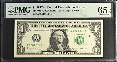 The product is a 2017 $1 Federal Reserve Note from the Boston district, graded by PMG as Gem EPQ with a grade of 65. This note is a replacement note, denoted by the star in the serial number (Fr-3006-A*), making it a collectible item. It is certified as authentic and in exceptional condition, suitable for collectors of small size U.S. paper money.