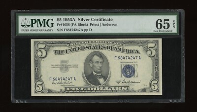 Friedberg # is 1656; serial # is F68474247A. Signatures are Priest and Anderson. DBR Currency – Online paper money at its finest. PMG has graded this note Gem Unc 65 EPQ, with the distinction of Exceptional Paper Quality.