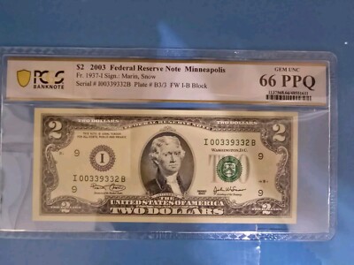 The product is a 2003 $2 Federal Reserve Note from Minneapolis, graded by PMG as 66 GEM UNC with the designation of EPQ/PPQ, indicating exceptional paper quality. This high-grade banknote is considered uncirculated and comes in small size denominations. It is a valuable piece of United States currency with meticulous certification, making it a sought-after item for collectors and enthusiasts of paper money.