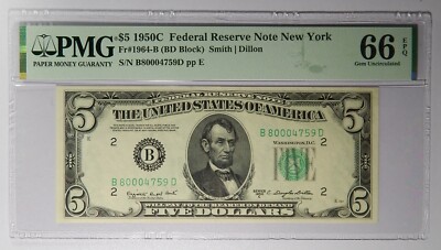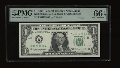 Friedberg # is 1900-Km; serial # is K01773988A. Signatures are Granahan and Dillon. DBR Currency – Online paper money at its finest. PMG has graded this note Gem Unc 66 EPQ, with the distinction of Exceptional Paper Quality.