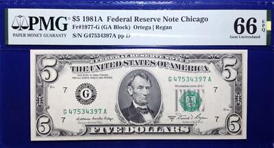 The product is a 1981A $5 Federal Reserve Note from Chicago, graded as PMG66 Gem PPQ. It is an uncirculated banknote with EPQ/PPQ designation, certified by PMG. It is a small size note in United States currency.