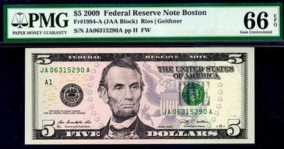 Find many great new & used options and get the best deals for 2009 $5 Boston Federal Reserve Note FRN • 1994-A • PMG 66 EPQ at the best online prices at eBay! Free shipping for many products!