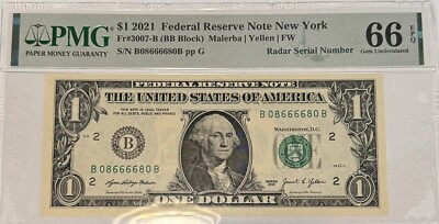 With its unique Radar Serial Number EPQ 66 PMG, this uncirculated banknote is a valuable addition to any collection. The bill is certified by PMG and has a grade of 66, with EPQ/PPQ designation.