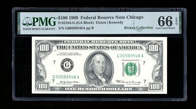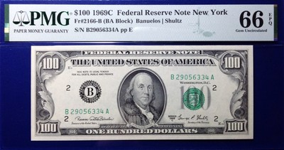 This 1969 $100 Federal Reserve Note is an uncirculated banknote with a grade of 66 and a certification of PMG. The note features a Fr-2166-B designation and is from the United States. This small size paper money is a great addition to any collection and a must-have for all PMG collectors. The note is from the Federal Reserve and is a true gem for collectors. Add this EPQ/PPQ grade banknote to your collection today!