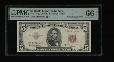 Friedberg # is 1535; serial # is C62491094A. Signatures are Granahan and Dillon. DBR Currency – Online paper money at its finest. PMG has graded this note Gem Unc 66 EPQ, with the distinction of Exceptional Paper Quality.