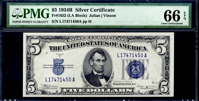 GEM UNCIRCULATED 66 EPQ. The overall eye appeal will be above average, and only the slightest soiling may be visible. A note with a horizontal fold and three vertical folds cannot technically grade XF, although a very light horizontal bend that does not “break” the surface of the paper might be acceptable at this grade level if the three vertical folds are not heavy and there are no other apparent flaws.
