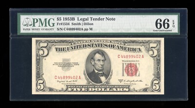 Friedberg # is 1534; serial # is C44899402A. Signatures are Smith and Dillon. DBR Currency – Online paper money at its finest. PMG has graded this note Gem Unc 66 EPQ, with the distinction of Exceptional Paper Quality.
