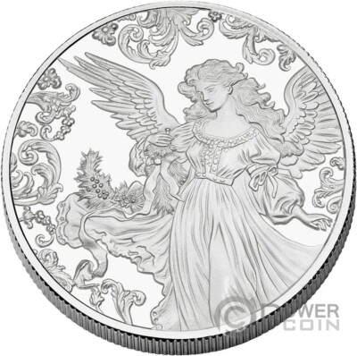 The reverse of the coin features an elegant depiction of the Christmas Angel, with flowing robes and detailed wings, holding festive decorations, such as holly leaves, symbolizing the spirit of Christmas.