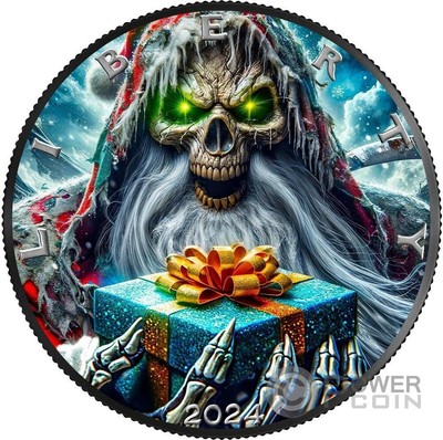 He holds a large scythe while guiding reindeer under a starry, moonlit sky. The reverse features a terrifying close-up of the Christmas Reaper’s skeletal face, his glowing green eyes peering out from beneath the hood.