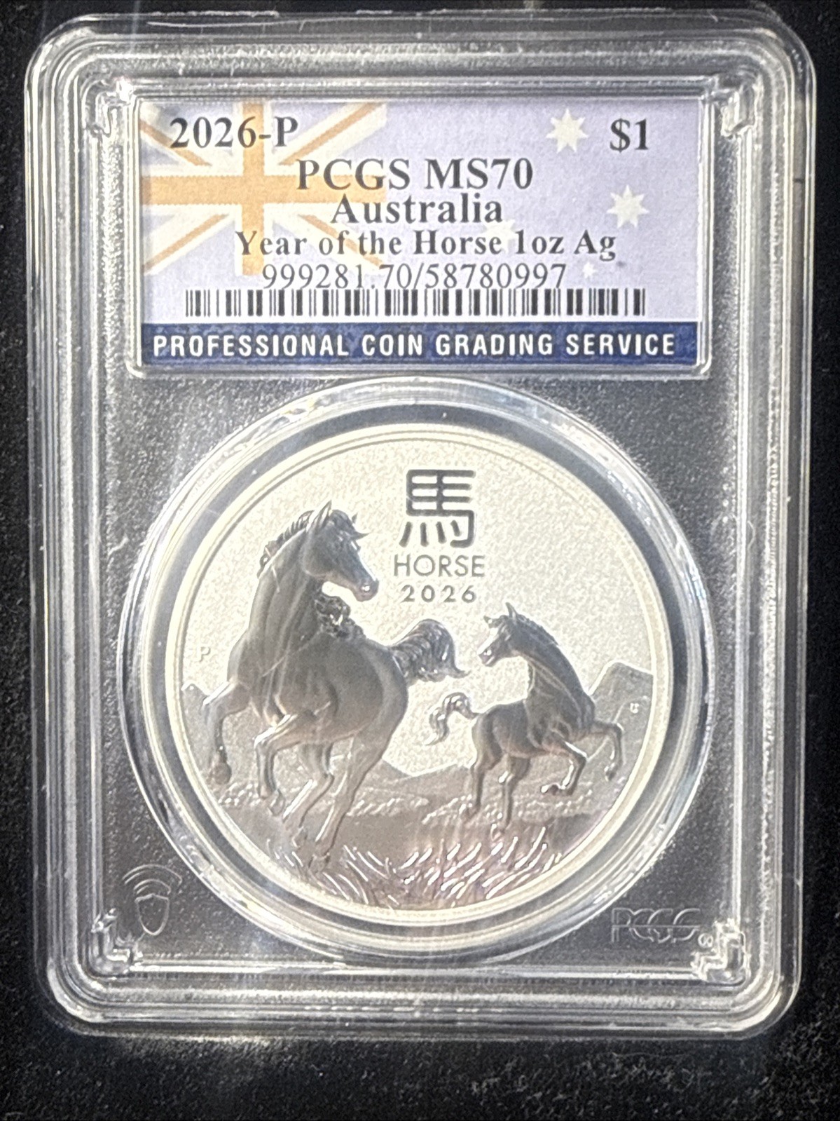 The 2026 Australia 1oz Silver Lunar Horse PCGS MS70 coin is a high-quality silver coin from The Perth Mint, featuring a business strike type with a fineness of 0.9999. This coin has been certified by PCGS and contains 1 oz of precious metal content. It is a great addition to any coin collection or investment portfolio, showcasing the unique design of the Australian flag label. Its grade of MS70 indicates that it is in excellent condition, making it a valuable and sought-after piece for collectors and investors alike.
