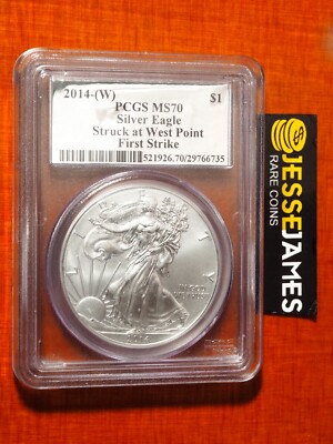2014 (W) SILVER EAGLE PCGS MS70 FIRST STRIKE. THERE IS NO MINT MARK ON THIS COIN. THIS COIN IS AUTHENTICATED SIMPLY AS BEING STRUCK AT THE WEST POINT MINT (AS OPPOSED TO BEING STRUCK AT SAN FRANCISCO).