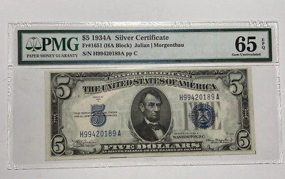 1934 A $5.00 SILVER CERTIFICATE PMG 65