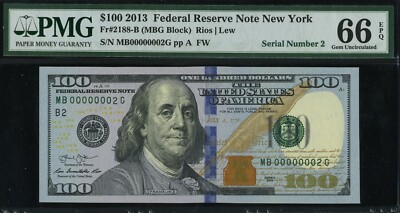 A single-digit serial numbered two. Third-party graded P.M.G #66EPQ Gem Uncirculated with exceptional paper quality. Fantastic note all the way around, gem fresh, centered well with embossing throughout.