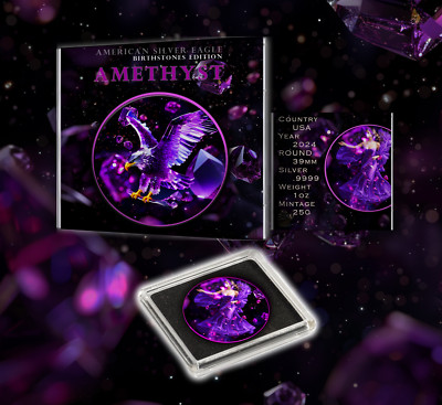 Here are the key details: Design: The obverse features Liberty with a gemstone overlay that flashes purple gemstone hues when held up to light. Composition: Each coin contains 1 Troy ounce of 99.9% pure silver.