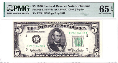 Find many great new & used options and get the best deals for 1950 $5 Federal Reserve Note Richmond Wide I PMG Gem Unc 65EPQ #E26016428A at the best online prices at eBay! Free shipping for many products!