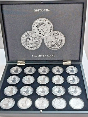 This set of 20 Britannia 2024 Fine Silver Coins is a must-have for any serious collector. The coins are presented in a stylish presentation box and are a beautiful addition to any collection. The set includes a total of 20 coins and features the iconic Britannia design.