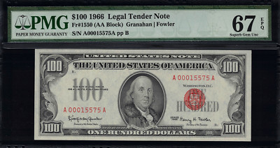 This vintage $100 bill from 1966 is a circulated piece of paper money with a red seal and the denomination of $100. It is a small size note that is perfect for collectors and those interested in United States currency. The bill has been certified by PMG with a certification number of 2079566-010 and a grade of 35. The country/region of manufacture is the United States and it is a great addition to any collection of US coins and paper money. Free shipping !