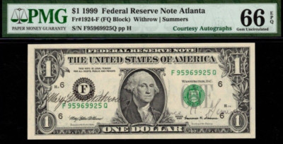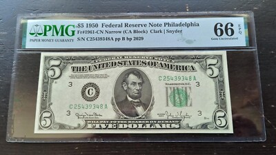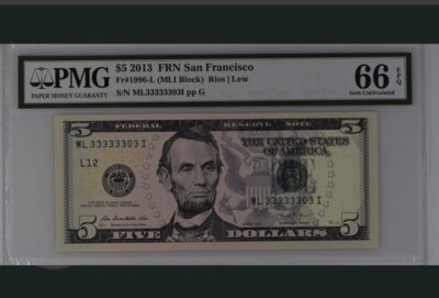 This $5 banknote from 2013 FRN San Francisco is a rare find with a near solid serial number of 3’S Six In Row UNC. It is uncirculated and has been graded EPQ/PPQ with a grade of 66. The note is from the United States and has been certified by PMG. This small size note is a great addition to any collection and is a must-have for all coin and paper money enthusiasts.