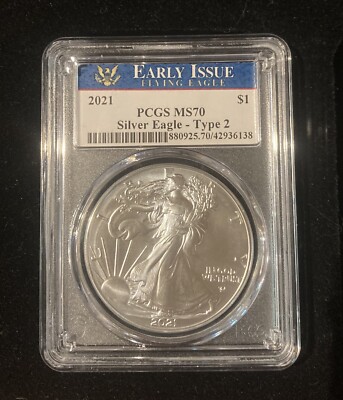 2021 silver eagle type 2 PCGS MS70 early issue, top pop. The coin in the photos is the coin you will receive , I will combine shipping. Thanks