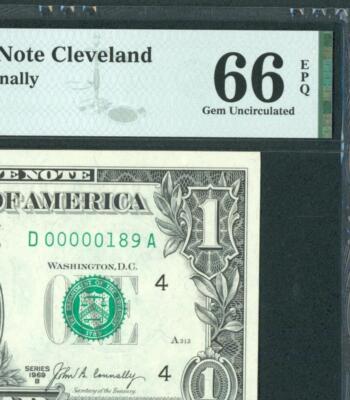 GEM UNCIRCULATED 66 EPQ. 4th of 9 Identical Serial #. Choice Almost Uncirculated (or Choice AU): A note in this grade will be a “just miss” for a Choice CU grade or higher. It will have above average eye appeal and will be attractive for the issue, but a bent corner or light vertical centerfold will keep it from an Uncirculated grade.