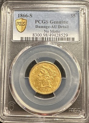 This rare 1866-S $5 Gold coin is a true gem for collectors. With a fineness of 0.9 and a mint location in San Francisco, this coin is a top 15% example of its kind. The coin features an intricate design and is certified by PCGS, ensuring its authenticity.