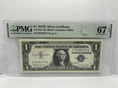 This 1957B $1 Silver Certificate is a rare gem that has been graded a 67 EPQ/PPQ by PMG. The certificate is uncirculated and comes with a certification from PMG. The denomination of the certificate is $1 and it was printed in 1957. This small size note is a great addition to any collection of paper money and is sure to impress.