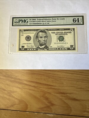 2003 $5 FEDERAL RESERVE NOTE ST LOUIS FR#1990-H PMG 64 EPQ LOW SERIAL NUMBER 40. Shipped with USPS Ground Advantage.
