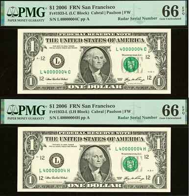 E-D Block. Quad serial number 00006666. Third Party Graded P.M.G #66EPQ Gem Uncirculated with exceptional paper quality. Quad serial, low serial, SIXERS.