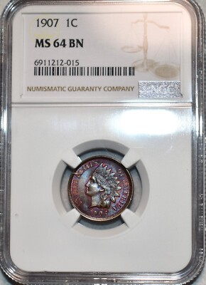 NGC MS-64 BN. 1907/7 Snow-7 Indian Head Cent. This piece has beautiful toning, blazing mint luster, and pleasing eye appeal. One of the Finest, if not the Finest known.