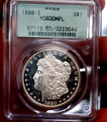 This rare 1880-S $1 Morgan Silver Dollar is a stunning addition to any coin collection. With its true deep cameo look and near DMPL rating, this coin is sure to impress. The coin features a beautiful composition of silver and has a fineness of 0.9.