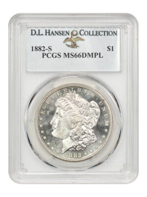 Deep, bowl-like luster from cupped dies create a really unique appearance on this beautiful coin. The watery mirrors and heavy die polish lines on the reverse are quite incredible to behold. Tied with 11 others at PCGS for the finest known in existence. – Morgan Dollar