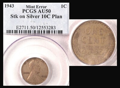 1943 1C PCGS AU50-RARE ONLY KNOWN MUSEUM PIECE MINT ERROR-STK ON SILVER 10C PLAN LINCOLN SMALL CENT. The preserved condition of the coin is the main factor to evaluate the market value which is beyond the PCGS, NGC, ANACS and ICG guidelines.
