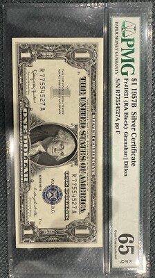 This $1 1957B Silver Certificate is a rare find for any collector of uncirculated paper money. With a grade of 65 and certification from PMG, this note is a valuable addition to any collection. The denomination of the note is $1 and it was printed in 1957.
