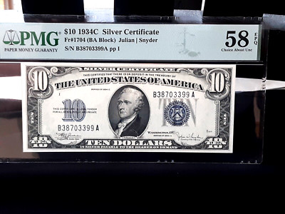 YOU ARE BIDDING ON A HIGH GRADE 1934 C $10 SILVER CERTIFICATE PMG 58 EPQ–THIS IS A GREAT NOTE FOR INVESTORS, AND OR COLLECTORS, NO RESERVE AUCTION SO GOOD LUCK AND HAPPY BIDDING THANK YOU