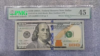PMG Certified Binary Serial, Choice Extremely Fine LK00001111D, truly unique among collectors. This only-one-to exist LOW SERIAL number is authentic graded and certified. Bid with CONFIDENCE!