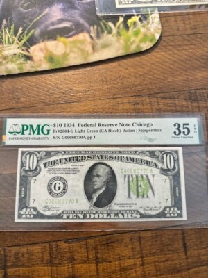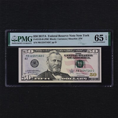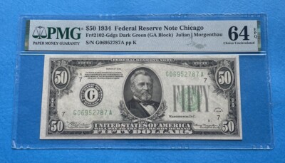 This 1934 $50 Federal Reserve Note is a rare gem in PMG 64 EPQ/PPQ grade designation. The dark green seal and Fr 2102 certification number make it a unique addition to any collection. This small size note was manufactured in the United States and is a great piece of American history. The certification is PMG and the denomination is $50. Take a look at the actual pictures for all the details. Thanks for your interest and your bid. We ship the day after the payment is made ground advantage. You can shop here with confidence. We are celebrating on 25th year selling on eBay. There are no returns on PMG graded notes.