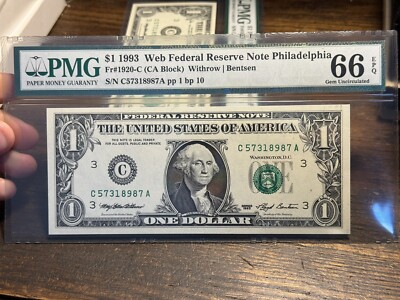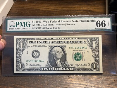 This 1993 $1 Web Press Note CA Block Run 10 Combo 1/10 PMG 66EPQ S/N C57318987A is a rare find for any collector or enthusiast of US paper money. The note is uncirculated and has been graded 66 with EPQ/PPQ designation, making it a valuable addition to any collection.